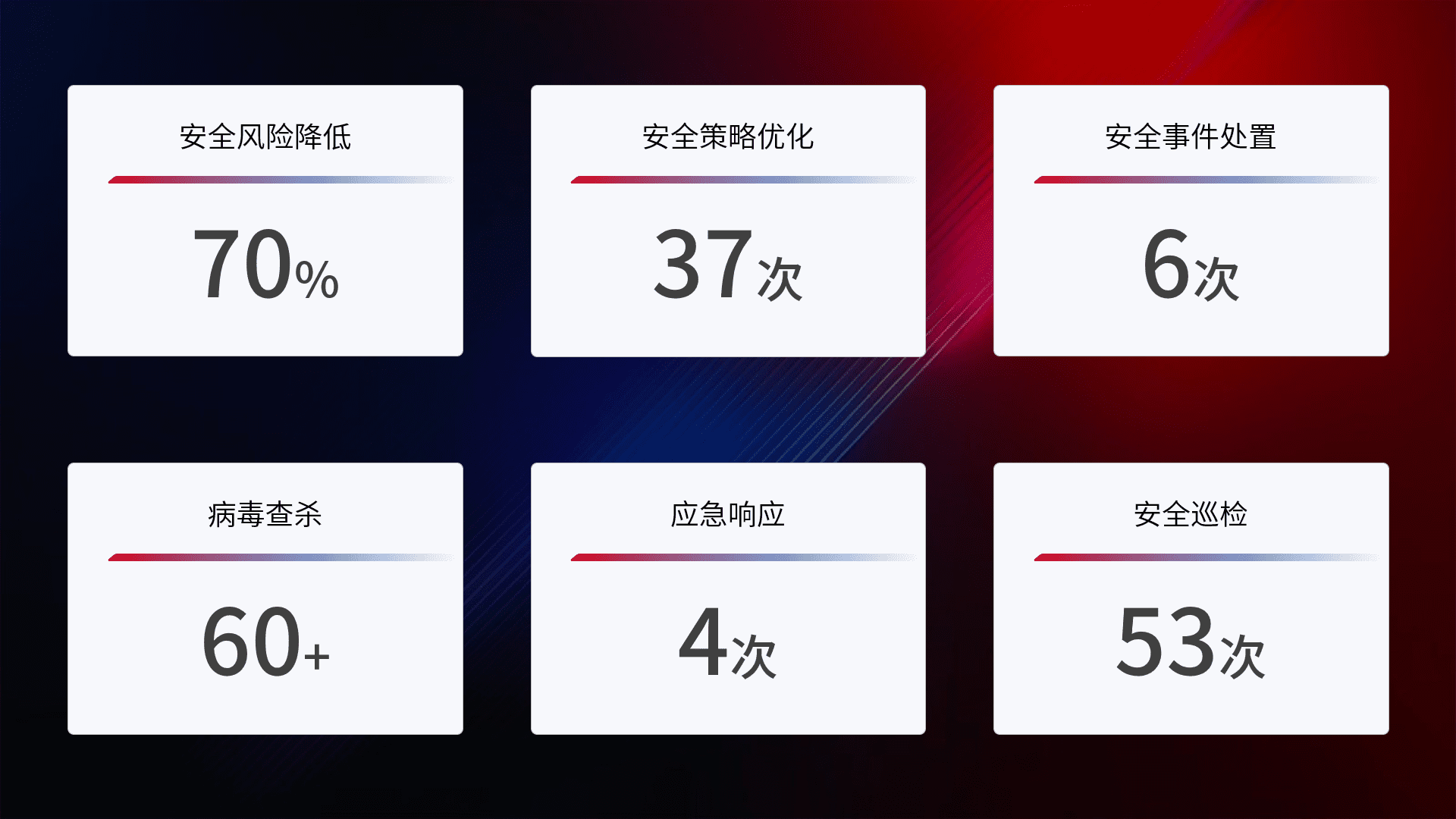 提供全面的安全事件报告体系,,,包括处置报告、、、周报、、、、季度和年度总结,,,,结合持续监控,,帮助客户深入了解网络安全状况。。