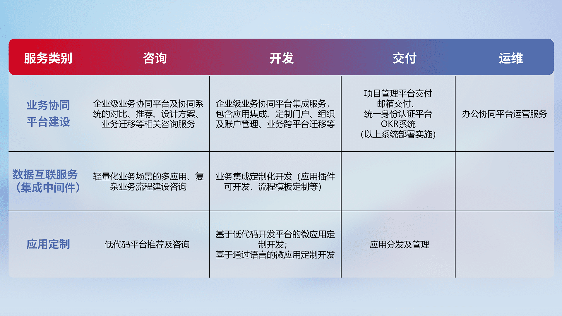 针对钉钉、、企微、、IDaas等平台级产品提供产品的规划、、、方案、、、交付、、、定制化开发等服务,,,实现如统一协同办公、、智能客户服务、、、、混合会议管理、、智能数据查询、、、等业务场景,,实现数字化转型。。。。